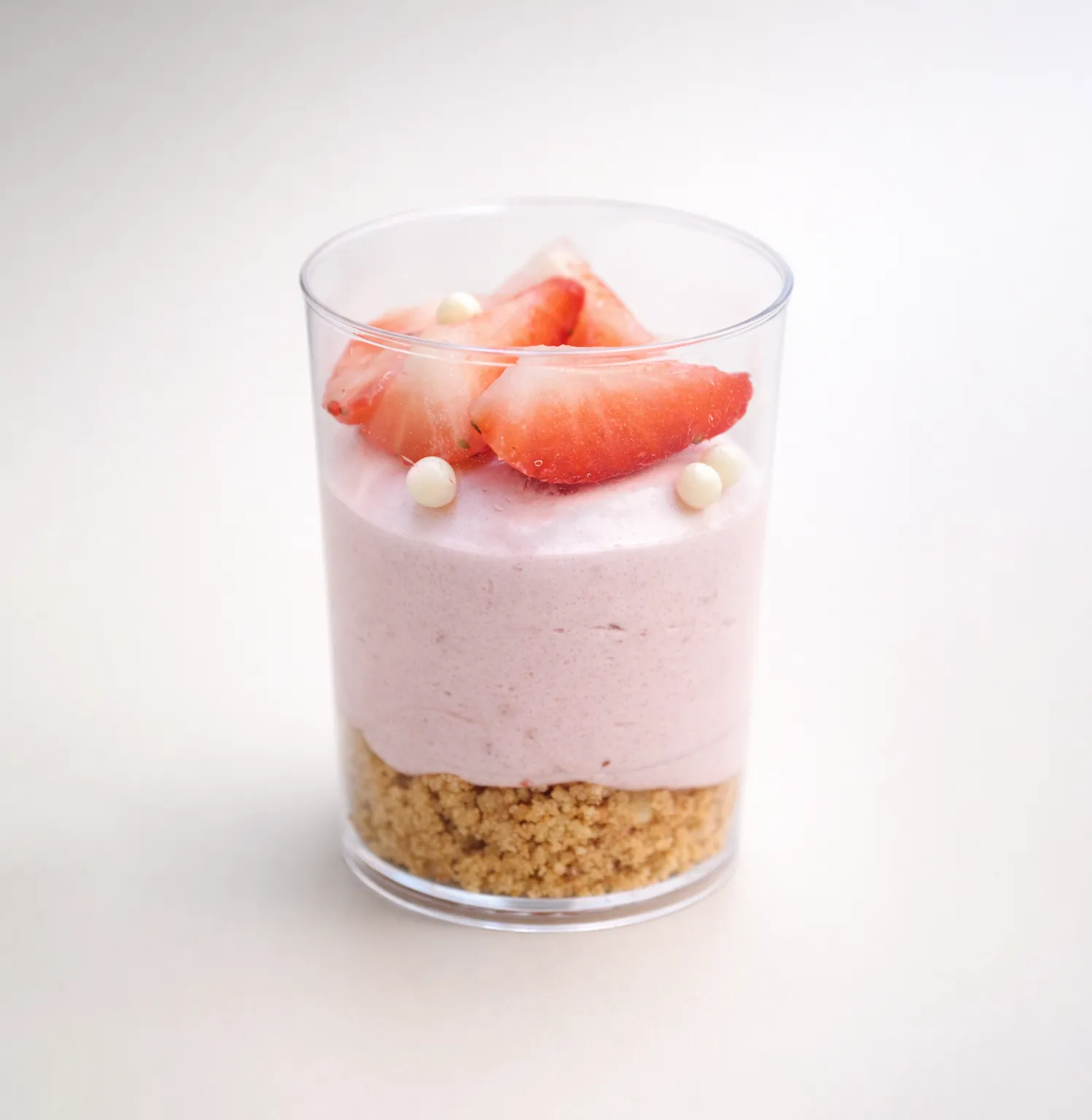 Desert pe bază de blat fărâmicios din unt 82,5%, cremă Philadelphia, pireu de căpșuni, frișcă naturală 36%, căpșuni, biluțe crocante.