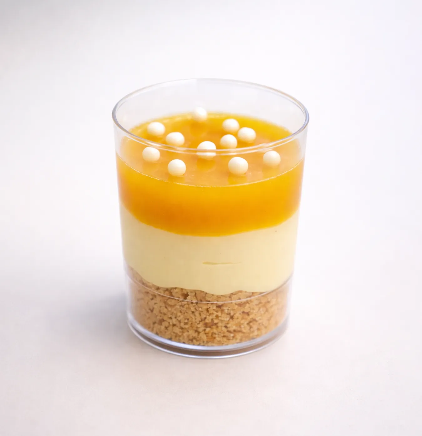 Desert pe bază de blat fărâmicios din unt, cremă Philadelphia, pireu de mango, frișcă naturală 36%, insert mango - maracuja, biluțe crocante.