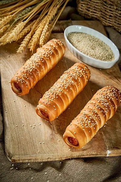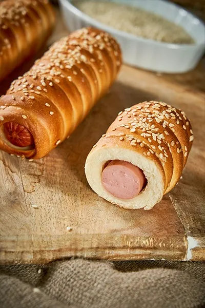 Produs din aluat cu drojdie, crenvurșcă c/s (carne vită, porc) semințe de susan, ouă proaspete de găină.