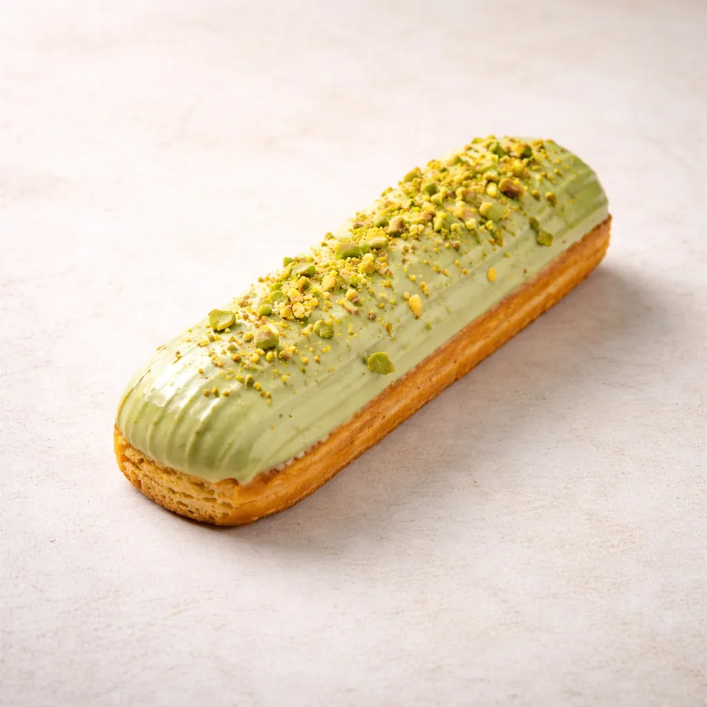 Prăjitură din aluat opărit, cremă de lapte și pastă de fistic, ciocolată albă, fistic.