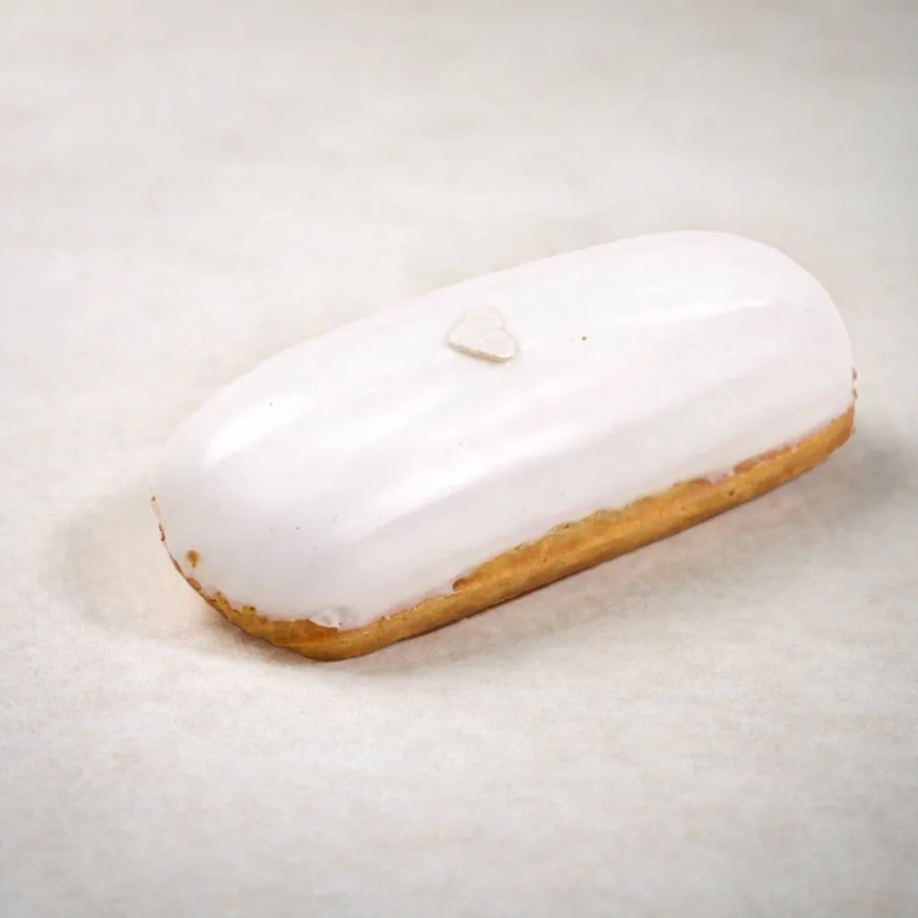 Prăjitură din aluat opărit, cremă de lapte, glazură de ciocolată albă.