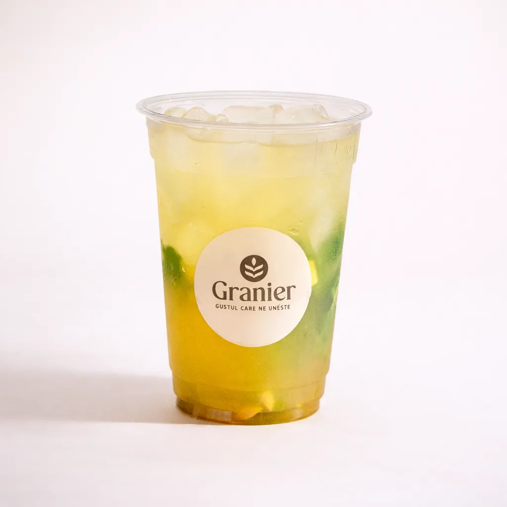 Băutură răcoritoare din apă carbogazoasă, lămâie, mentă, piure de yuzu, sirop de lămâie, sirop de zahăr.