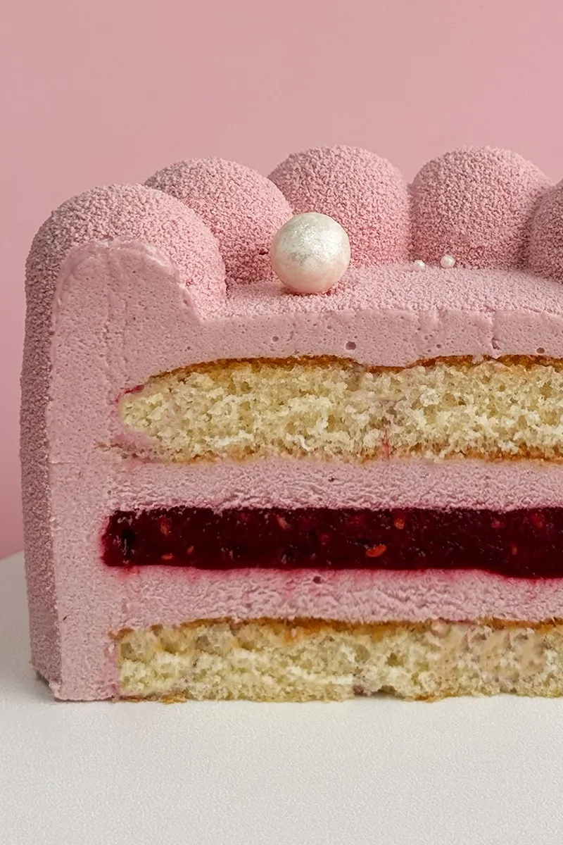 Торт мусс из белого шоколада с малиновой начинкой и ванильным бисквитом, с кусочками малины.